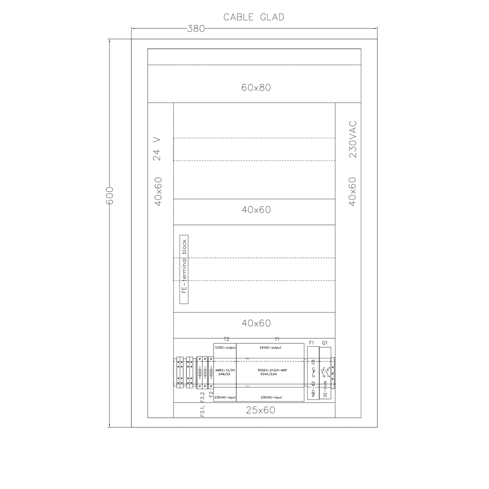 Casing package W380 x H600 x D210. Space for example for. 2 pcs Ouflex, 63VA / 24 VAC, 24W / 12 VDC